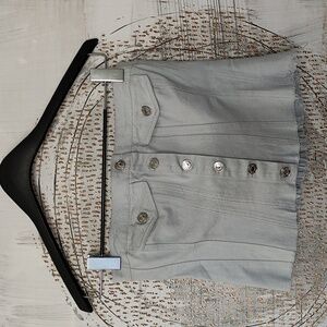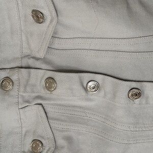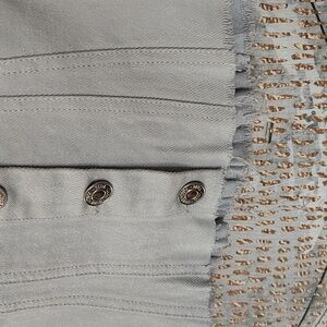 Button front, light denim color (faded blue/gray) with a bit metallic, some faint tiny glitter.