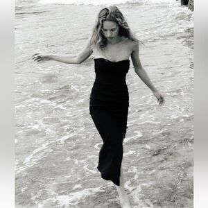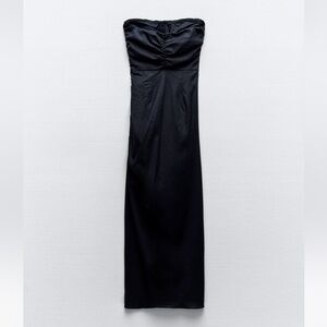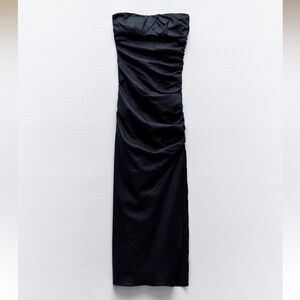 New ZARA Linen Bland Ruched Strapless Midi Dress