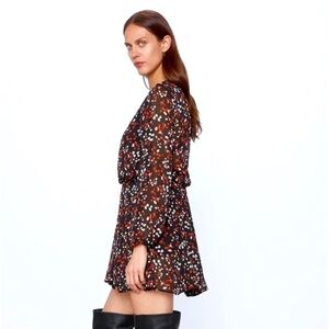 Short round neck flowing dress with long sleeves. Featuring elastic waistband detail, button fastening and an opening at the back.