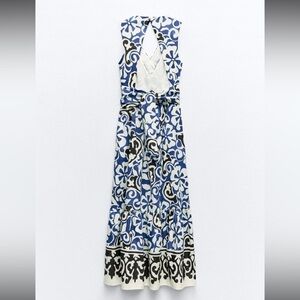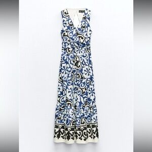 Sleeveless V-neck dress. Wrap front waist with bow and open back. Flounced hem. Side hidden in-seam zip closure.
