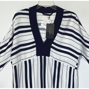 New ZARA White & Navy Blue Stripes High Low V-Neck Tunic Top