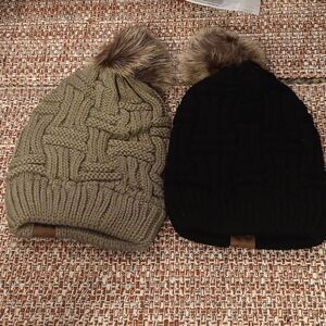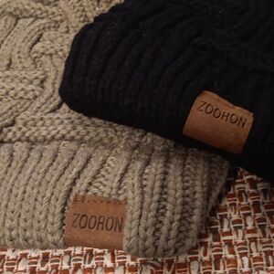 ZOORON Women's Chunky Standard Horizontal And Vertical Pattern Ball Black And Khaki Beanies. New