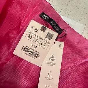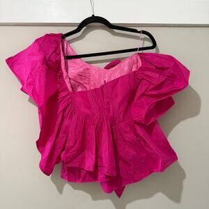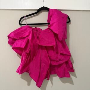 Zara Asymmetric Ruffled Top in Fuchsia. Women's Size M / Medium. Features crop length, corset style boned bodice, rosette front detail, voluminous ruffles, one shoulder, pull on style. 100% polyester. Brand new with tags.