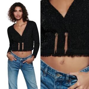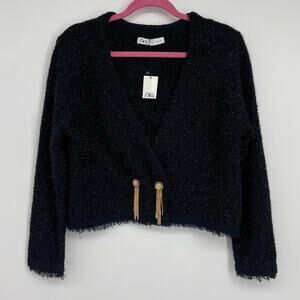 New Zara Black Metallic Tweed Wrap Cropped Cardigan W/gold Chain Button Size Large