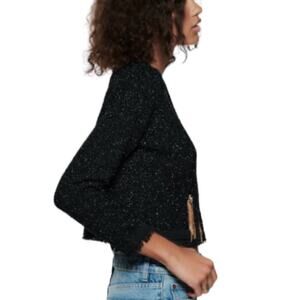 New Zara Black Metallic Tweed Wrap Cropped Cardigan W/gold Chain Button Large