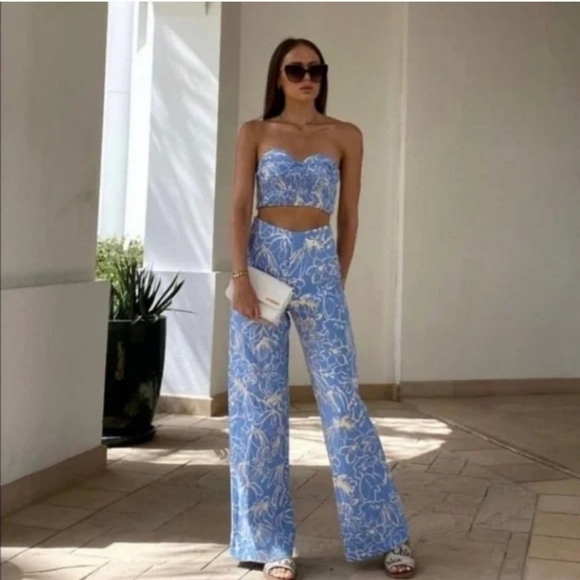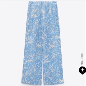 New With Tag Zara Full Length Floral Linen Blend High Waisted Blue/White Pants
