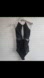 Halter bodysuit with exposed shoulders. Front cut out detail. Chest panels are double layered and snap button at bottom with tonal bows at back.