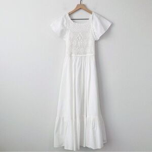 Zara Linen Crochet Bohemian Open Back Tiered Ruffle Sleeve White Maxi Dress.