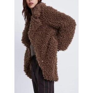 New Zara Outerwear Brown Fluffy Teddy Bear Curly Faux Fur Jacket Coat