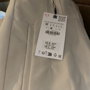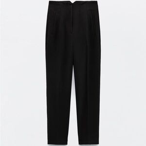 Pants with a high waist and pronounced seams at front and back. Front welt pockets. Front zip, metal hook, and interior button closure.