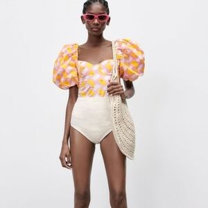 New With Tag Zara Poplin Floral Embroidery Puff Sleeves Barbie Pink Geo Print Bodysuit /Top