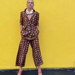 New With Tag Zara Printed Double Breasted Tie Belt Brown Blazer