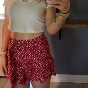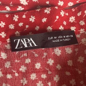 This is an adorable flowy skirt from Zara with simple feminine floral details. It comes with a removable matching tie. It has a side zipper, as well as shorts underneath.