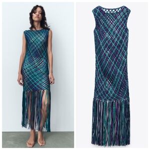 New Zara Satin Effect Woven Braided Fringe Blue Dress/Swim Cover-Up Blogger Fav