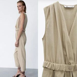 New Zara Textured Linen Blend V-Neck Sleeveless Belted Tan Jumpsuit NWT Small