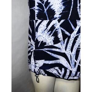 The New Zenergy CHICO'S Jacket in size L features a stylish blue ombre leaf print, making it perfect for travel and casual occasions. Made from a blend of polyester and spandex, this 3/4 sleeve windbreaker offers a classic fit and is lightweight, making it ideal for the summer, fall, and spring seasons. With a full zip closure, collared neckline, and pockets, this jacket combines functionality with a colorful and leafy theme, showcasing the brand's signature style. Perfect for adding a touch of beach-inspired flair to your wardrobe.