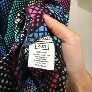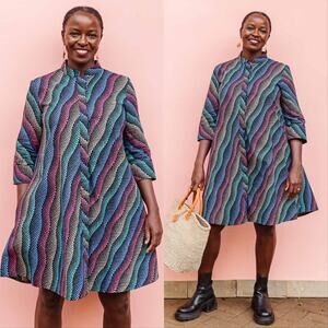 Zuri Aurora Dress. Women's Size S / Small Standard. Features mid weight, non stretchy fabric, kitenge African wax print, functional pockets, button fastening through front, high neckline, 3/4 sleeve, knee length, unlined, airy fit, cut to be worn loose and stand away from the body. 100% cotton. Brand new with tags.