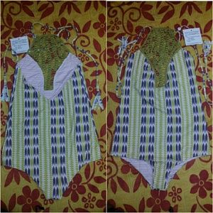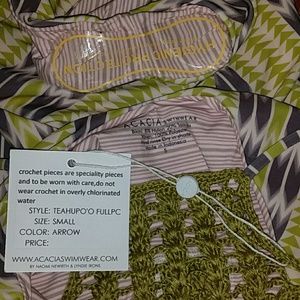 Brand new with tag, hygienic protection strip & still in original manufacturer's plastic. Teahupoo crochet onepiece swimsuit in arrows print by acacia swimwear. Small. Lilikoi green crocheted macrame from chest to neck. Arrow is a lilikoi green & fig brown geometric tribal print. From the 2014 pa 'ana a ka la collection. No trade please. Price is firm & reflects high % posh fee