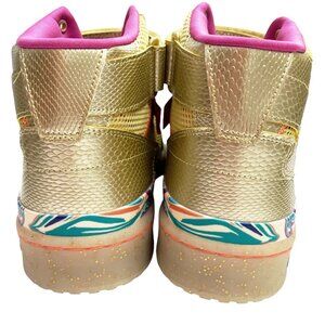 adidas Men’s Forum Mid Carnival Sneaker. Style #ID8615. Faux snakeskin leather trim in a shimmery gold tone. Midsole and outsole are sprinkled with gold glitter. On the medial side, there is a tag commemorating the School for Experiential Education Design. Part of adidas’ Mas Nation collection. Hook-and-loop lockdown strap. This shoe style was originally released in February 2024. The sneaker’s design is in celebration of Caribbean culture and the festive energy of carnival season.