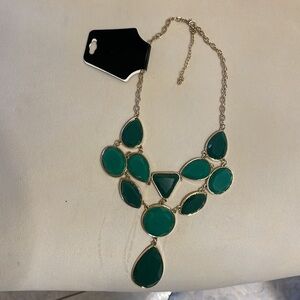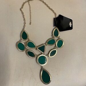 New bib style tier drop layer statement necklace. Green and gold w/ extension