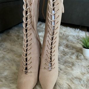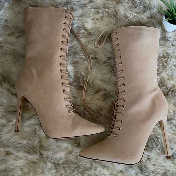 Light beige suede only tried them on so there might be a little scuff on the right side that can easily cleaned