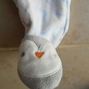 Baby blue and white onesie with cute little penguin footsies! (Gently used)