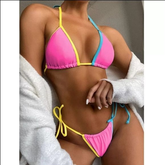 brazilian style Women's Color Block Halter Triangle Top and Tie Side Bikini Set Swimsuits top quality guarantee #120