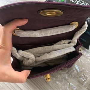 This Coach Parker 18 Crossbody Bag In Plum Velvet With Rivets – 31034 is brand new with original factory tags. This bag is plum colored and made from super soft velvet with rivets. This bag measures 7.25″ L x 5″ H x 3.25″ W and has a strap drop of 21.25″. Features gold toned hardware on the turnlock closure, rivet detailing, and throughout the strap. Includes one exterior and one interior slip pockets. This bag includes the original dust bag as well as the care instructions.