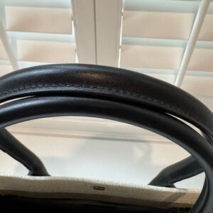 Elegant tote with bold black lettering. Features sturdy black handles.