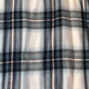 Extremely soft and comfortable white, navy, black & pink plaid shirt. Longer in the back then the front.