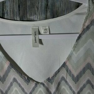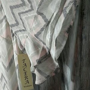 New dress size 3x around knee length or just below it. Never worn with tags. An elegant dress light weight with yet a ready for any kind of function look. Zig zagish cool pattern in grey, white & light mauve. The mauve is light and slightly resembles a peachy color. But I see it very light mauve and close in color because it's so light.