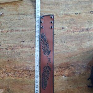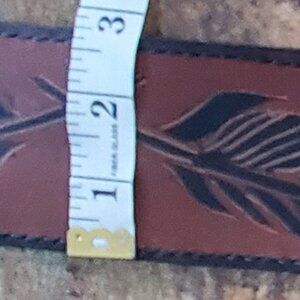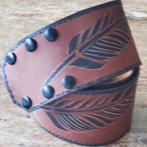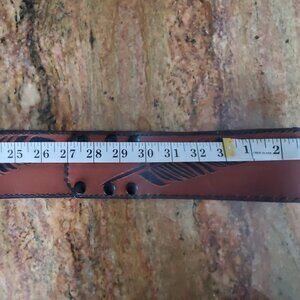 Brand new. Hand-cut from whole grain chrome-tanned leather, this 33-inch waist cinch belt features a hand-carved, painted, and burned black leaf motif—a symbol of resilience and rooted movement.