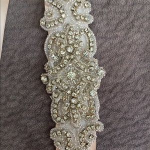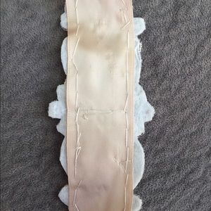 Hand beaded on high quality 1.5 inch satin ribbon. Color is champagne, with a blush tone (as opposed to a beige or peach tone). Sash is 114 inches in length. Length of beaded piece is just over 7 inches, widest part of beading is 2.5 inches. PRICE IS FIRM