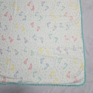 This NEW handmade one of a kind baby blanket features baby feet on one side, & turquoise on the other with crocheted edges. It is 32" by 34" & homemade. ☆☆☆Feel comfortable purchasing from me. I am a 5 star posh ambassador with same day shipping ☆☆☆ Item # J0002325