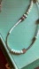 African recycled glass, African bone, pyrite, black mother of pearl, vulcanite heishi (record beads), brass, hematite spacers, pewter clasp.