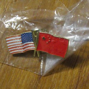 New in Package: USA and China Crossed Flags Pin This is a clean, new example of a classic "Friendship Pin," symbolizing the relationship between the United States and China. Design: Features the US Flag and the Chinese Flag crossed, with vibrant enamel colors. Condition: The pin is New and Sealed in its original clear plastic packaging. Backing: The back of the pin features a military clutch (butterfly clasp) for secure wear. Use: Ideal for collectors of diplomatic pins, world flags, or as a wearable piece to represent both countries. A great addition to any collection, especially valued because it remains unopened!