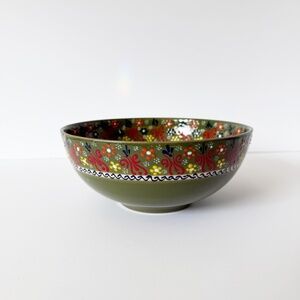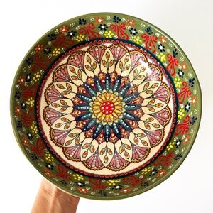 New in Box handpainted Turkish Ceramic Bowl measuring 8 inches with a 3 inch depth Lovely colors, great as a serving bowl or a large portion bowl for one! Dishwasher and Microwave Safe.