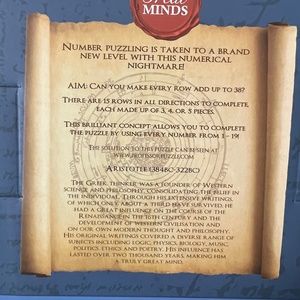 New. Never opened. Aristotle's number puzzle. Number puzzling taken to a new level! Can you make every row addd up to 38? There are 15 rows in all directions to complete. Each made up of 3, 4, or 5 pieces. The solution can be seen at www.professorpuzzle.com