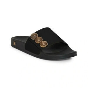 New in Box Balmain Symi Slided Leather Button Shoes Sandals Smooth Black Gold