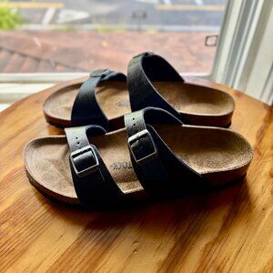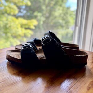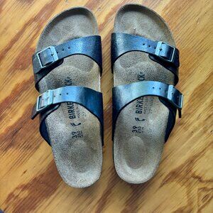 Brand new Birkenstocks that arrived late after I had already left for a trip, and I couldn't return them. They're perfect in every way, just not the plain black I thought they were—the licorice color has a very subtle metallic sheen.