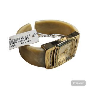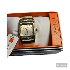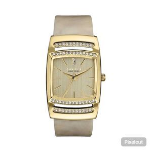 The New in Box Caravelle 44L142 Women's Watch is a stylish quartz yellow wristwatch with a stainless steel case and creamy color plastic strap with mineral crystals and a rectangular case shape. This watch is water resistance up to 100 feet. The Caravelle brand ensures quality and reliability in this analog display timepiece, making it a practical and fashionable accessory for everyday wear.