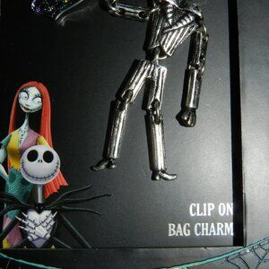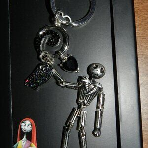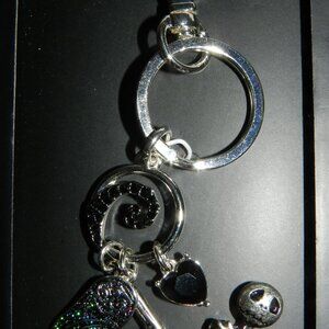 Disney Tim Burton's Nightmare Before Christmas Key Chain Key Ring Bag Charm. This has a Jack Skellington with moveable joints and limbs, a glittery Sally charm, a black heart, and bejeweled spiral hill charm.. Brand new in box.