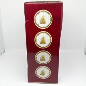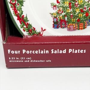 Vintage set of four Christmas Tree porcelain salad plates. Trim of holly, berries and red bows 8.25". New in box. Discontinued/retired print.