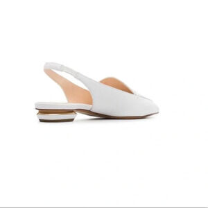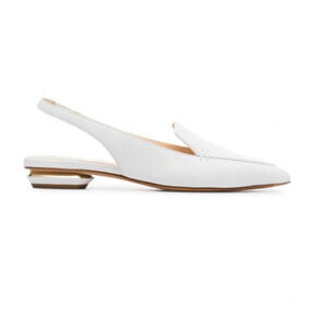 Luxury footwear designer Nicholas Kirkwood should have been an architect. His innovative sculptural silhouettes and risk-taking attitude surely mean business. These white Beya Sling Backs from Nicholas Kirkwood feature a slingback ankle strap, a branded insole, a pointed toe and a low heel with a gold-tone panel.