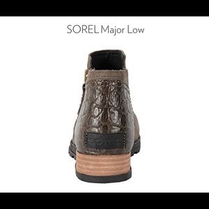 Brand New in box military-inspired Sorel® Major Low boot! Size 9.5. Major Pebble is the color (dark brown). Seriously cute!!! Full grain leather and suede upper. Leather wrapped heel. Removable molded EVA footbed with microfleece topcover for foot-hugging comfort and excellent underfoot support. Leather-wrapped heel. Durable rubber outsole with herringbone pattern for excellent traction.