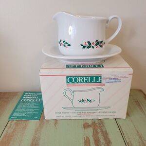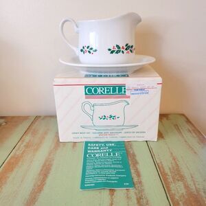 New in Box Vintage Corelle Winter Holly Ceramic Gravy Boat with Underplate