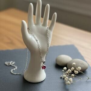 This is a brand new, stunning necklace featuring a lab-created ruby pendant on a delicate silver chain.