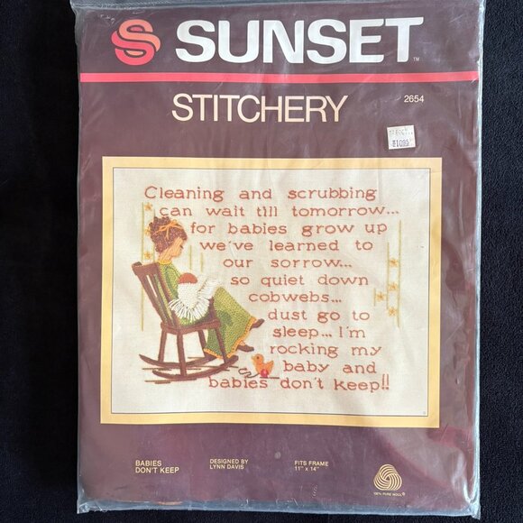New in bag, Vintage 1977, Sunset Stitchery Kit "Cleaning and scrubbing can wait till tomorrow..."