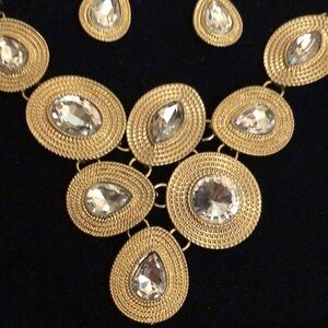 Statement jewelry set. Gold tone. Glam style. Necklace with rhinestone textured geometric plate links, matching drop earrings and bracelet adjustable.