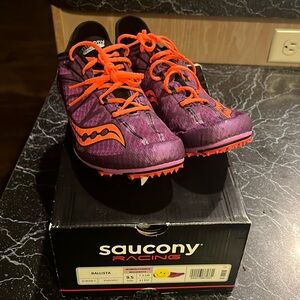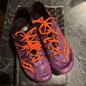 Perfect for track or cross country. Main color is purple. Includes spikes. Ladies size 9.5. Brand new in box. Never worn.